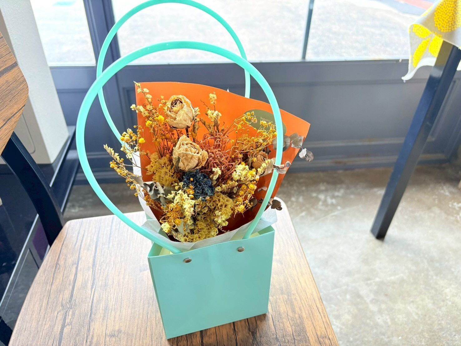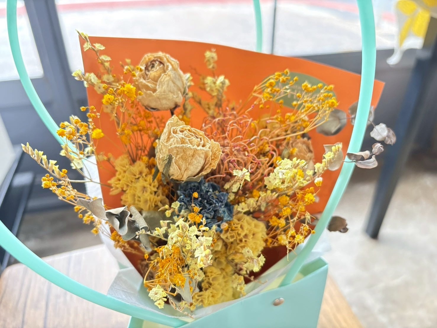 ・素材: ドライフラワー(イエローバラ、ピンクッション、ブルーカーネーション、イエロースターチス、染めかすみ草、HBスターチス、グニューカリ) 、ラッピング和紙、リボン(ラフィア)、ペーパーバスケット(内側防水加工済み)