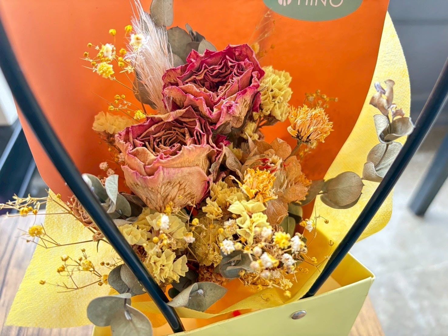 ・素材: ドライフラワー(バラ、スターチス、ベニバナ、姫ひまわり、パンパス、染めかすみ草、スプレーバラ、グニューカリ) 、ラッピング和紙、リボン(ラフィア)、ペーパーバスケット(内側防水加工済み)