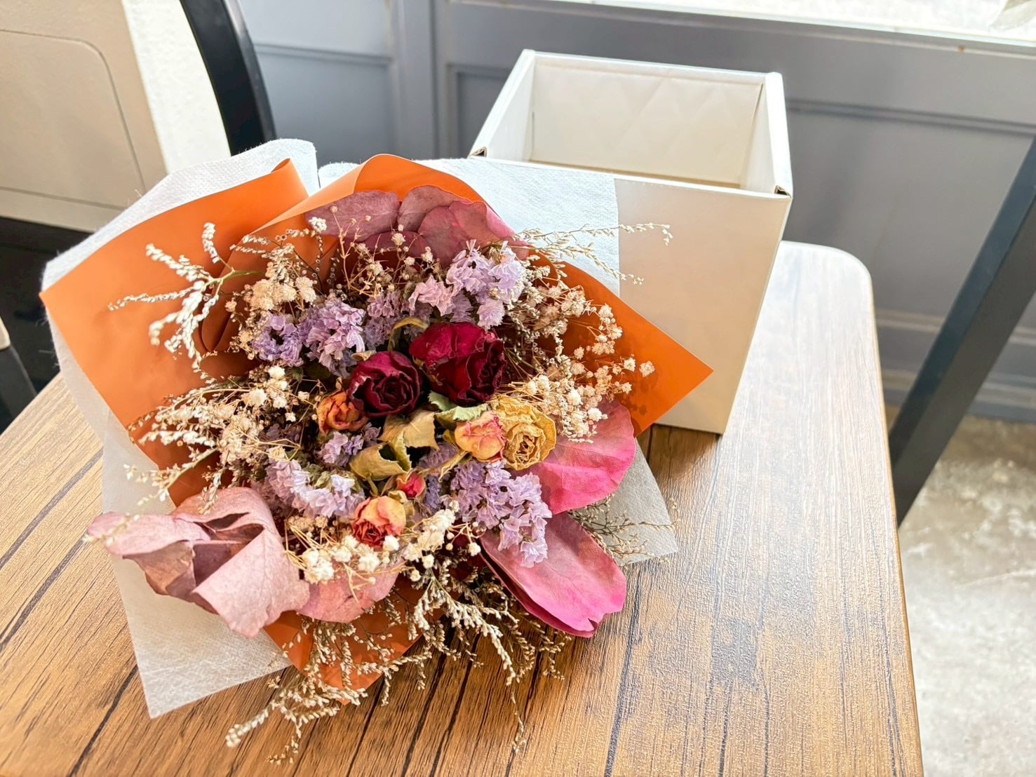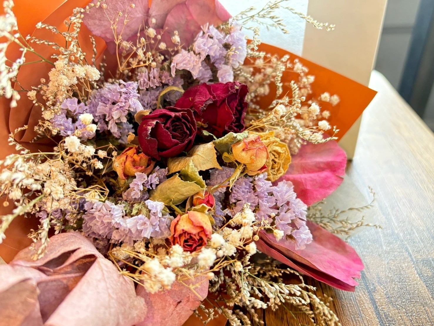 ・素材: ドライフラワー(バラ、スプレーバラ、スターチス、ブルーファンタジア、かすみ草、染めユーカリ) 、ラッピング和紙、リボン(ラフィア)、キューブBOX(段ボール(薄手)